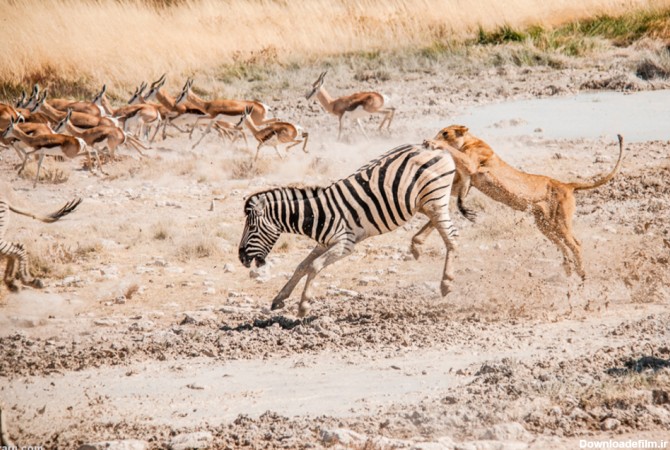 یک شیر ماده در سرنگتی تصمیم گرفت جلوی ازدحام گورخرهای در حال دویدن بایستد و سعی کند یکی را بگیرد اما زیر دست و پای آنها لگدمال شد. شیرهای ماده در نهایت دو گورخر را گرفتند.