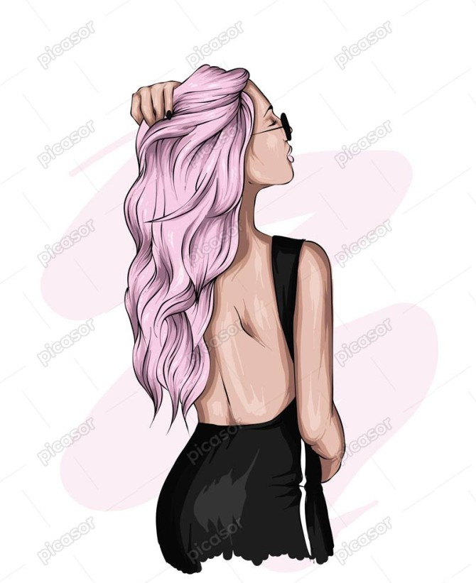 وکتور دختر فشن از پشت سر با استایل دخترانه و لباس شیک مشکی و ...
