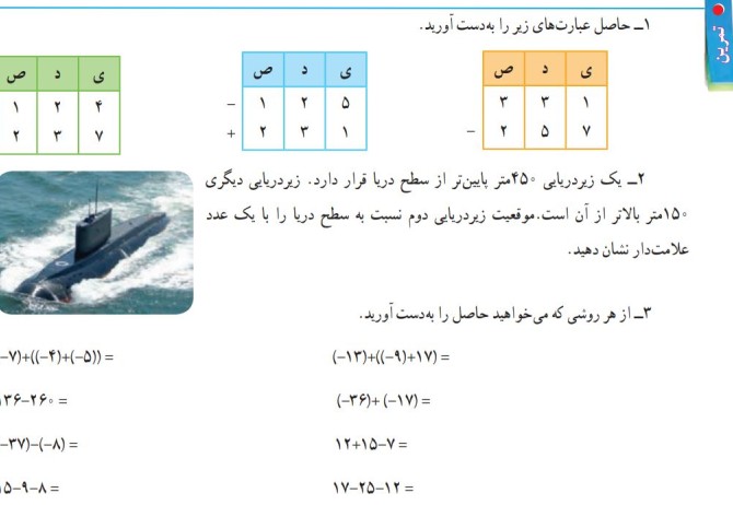 پاسخ تمرین صفحه ۲۲ ریاضی هفتم سوال ۱: حاصل عبارتهای زیر را به دست آورید. جواب: سوال ۲:یک زیر دریایی ۴۵۰ متر پایینتر از سطح دریا قرار دارد. زیر دریایی دیگری ۱۵۰ متر از آن بالاتر است. موقعیت زیردریایی دوم نسبت به سطح دریا را با یک عدد علامتدار نشان دهید. جواب: سیصد […]