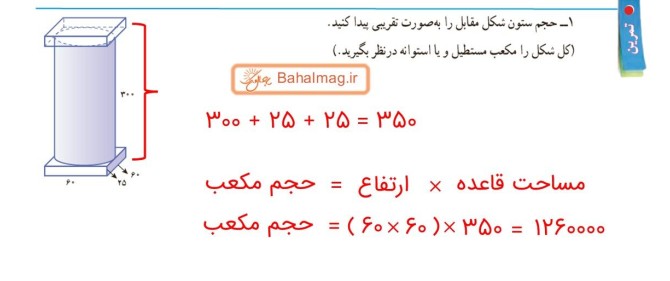 پاسخ تمرین صفحه ۷۵ ریاضی هفتم سوال ۱: حجم ستون شکل مقابل را به صورت تقریبی پیدا کنید. (کل شکل را مکعب مستطیل و یا استوانه در نظر بگیرید.) ۲۰ ریاضی با یک ویدئو ۲ ساعته از اینجا شروع کن جواب: سوال: حالا کمی دقیقتر محاسبه کنید و آن را به سه قسمت تقسیم کنید […]
