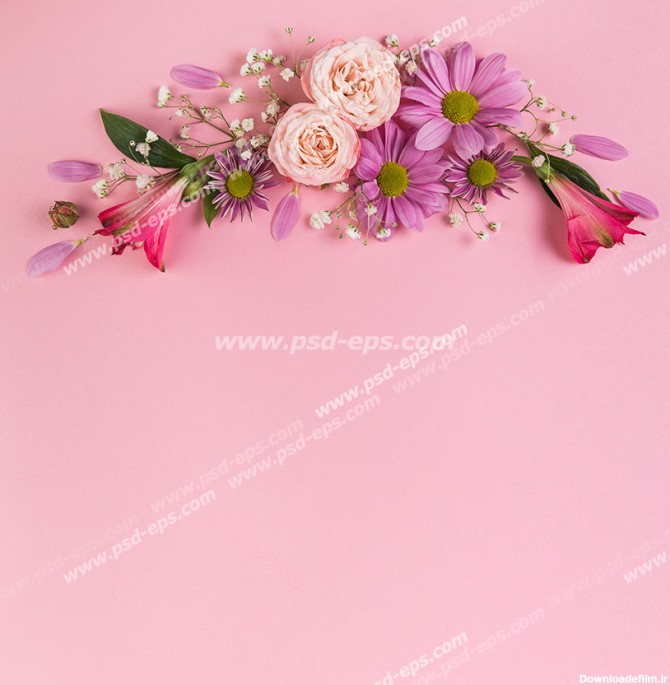 عکس با کیفیت پس زمینه صورتی با گل های ژبرای سوسنی ، گل صدتومانی کرمی و نیلوفرهای زیبا