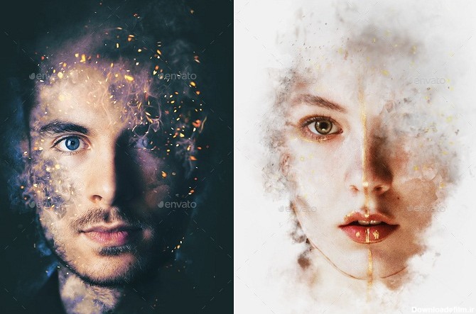 دانلود افکت آماده هنری فتوشاپ با نام Artistic Smoke Portrait مخصوص ادیت عکس های پرتره ;کیفیت عالی 6000x8000 کاملا لایه باز با فرمت PSD استفاده سریع و آسان در فتوشاپ شامل 4 افکت مختلف و زیبا