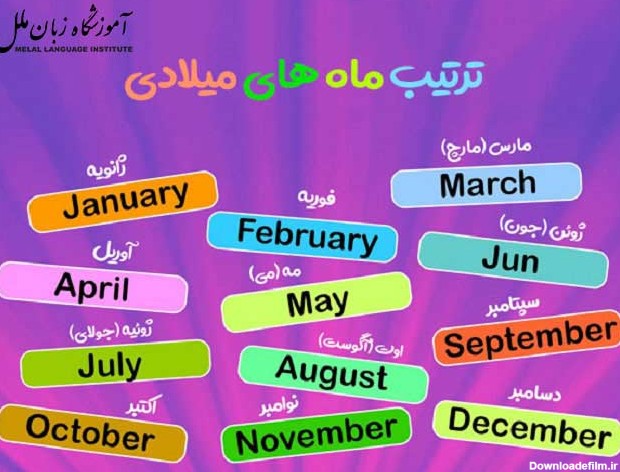 ماه های سال به انگلیسی به ترتیب: ژانویه January، فوریهFebruary، مارسMarch، آوریل April، میMay، ژوئنJune، جولایJuly، آگوست August، سپتامبرSeptember، اکتبرOctober