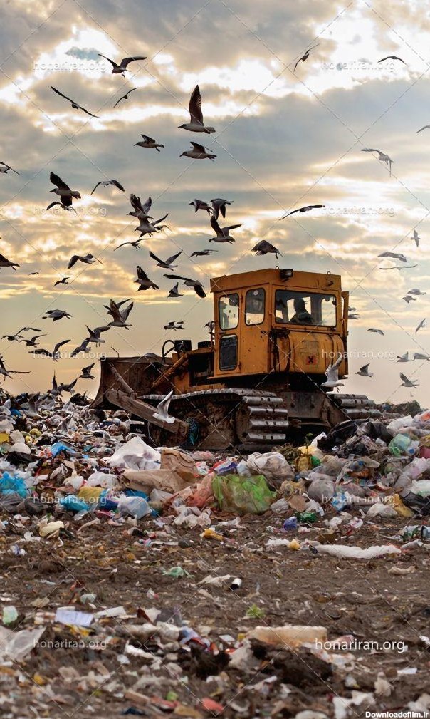 دانلود عکس با کیفیت ماشین زرد بلدوزر در حال جمع آوری زباله + این تصویر مورد استفاده برای: طبیعت و ضایعات + با رنگ بندی: زرد و مشکی و سفید