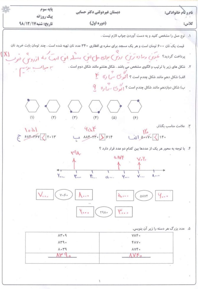 نمونه سوال ریاضی سوم دبستان فصل ششم با جواب