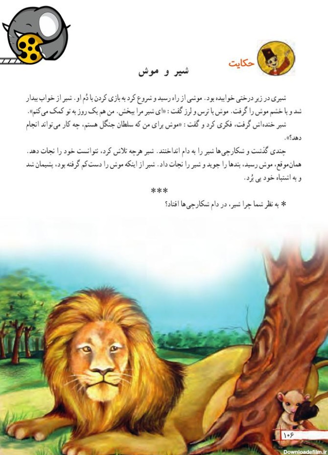 روزی شیری در خواب بود که موشی کوچک روی پشت او به بازی و جستوخیز پرداخت. جستوخیزهای موش کوچک بازیگوش