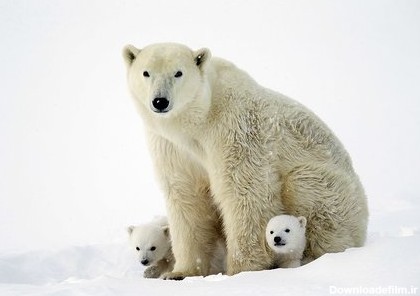 دو توله خرس قطبی پس از بیرون آمدن از لانهشان در قطب شمال از سر و کول مادرشان بالا می روند. در این عکس یکی از توله خرسها به دوربین نگاه میکند، گویی به ما لبخند میزند.