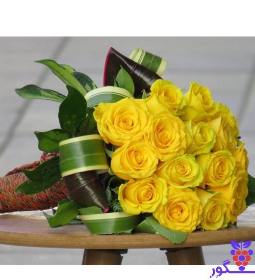 دسته گل رز قرمز که دارای حدود هفتاد شاخه گل رز قرمز می باشد و دور گلها با برگ پالم سبز تزیین شده و به وسیله بند چوبی بسته شده که به سفارش مشتری رنگ و تعداد گلها قابل تغییر
