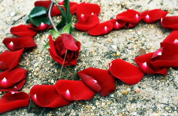 عکس عاشقانه قلب از گل رز ، تصویر عاشقانه از گل رز خوشگل به شکل قلب ساخته شده با گلبرگ های گل رز سرخ، دانلود عکسهای زیبای عاشقانه و رمانتیک از طراحی شکل قلب قرمز توسط گلبرگ های پرپر شده گل رز زیبای قرمز و تک شاخه گل رز میان قلب روی زمین