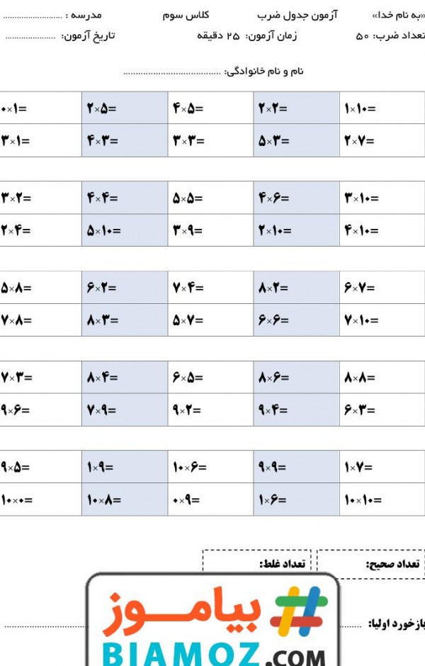 آزمون جدول ضرب ریاضی فصل 4 ضرب و تقسیم (سری1) — سوم دبستان