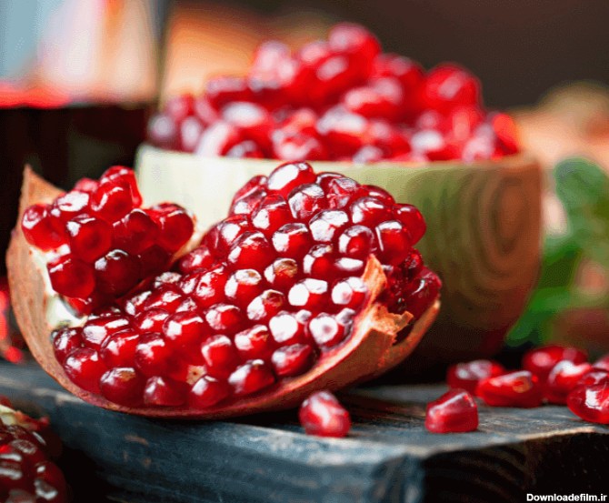 عکس با کیفیت انار تازه و خوشرنگ در کنار تکه های انار با دانه های قرمز مناسب شب یلدا