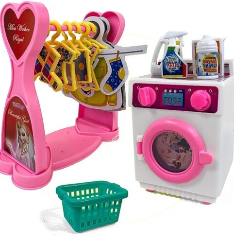 خرید ماشین لباسشویی صورتی دخترانه با طراحی زیبا و خوش رنگ - این اسباب بازی دارای یک محفظه چرخشی ، کشو ، دکمه و شیلنگ آب می باشد