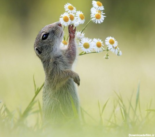 ثبت لحظه ایستادن سنجاب برای بو کردن گل توسط یک عکاس.