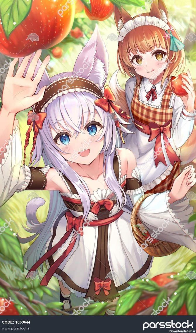 تصویر انیمه دو دختر گربه ای با موهای سفید و قهوه ای و پیراهن سفید در باغ سیب - بزرگترین مرجع خرید و فروش عکس و طرح لایه باز با کیفیت بالا در ایران در پارس استاک.