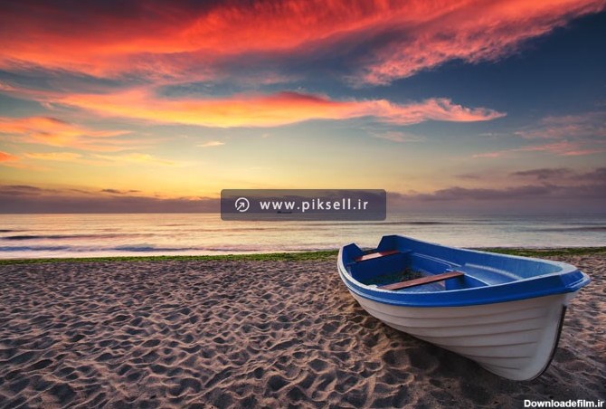 دانلود تصویر HD و با کیفیت از ساحل دریا و یک قایق بر روی ماسه ها . ارائه شده با پسوند jpg