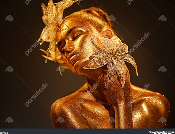 مدل زن مد مدل بالا با زرق و برق های طلایی روشن بر روی پوست نما گل فانتزی پرتره دختر زیبا دختر درخشان آرایش طلا و جواهر طلا و جواهر زرق و برق دار درخشان طلایی پوست جواهرات - بزرگترین مرجع خرید و فروش عکس و طرح لایه باز با کیفیت بالا در ایران در پارس استاک.