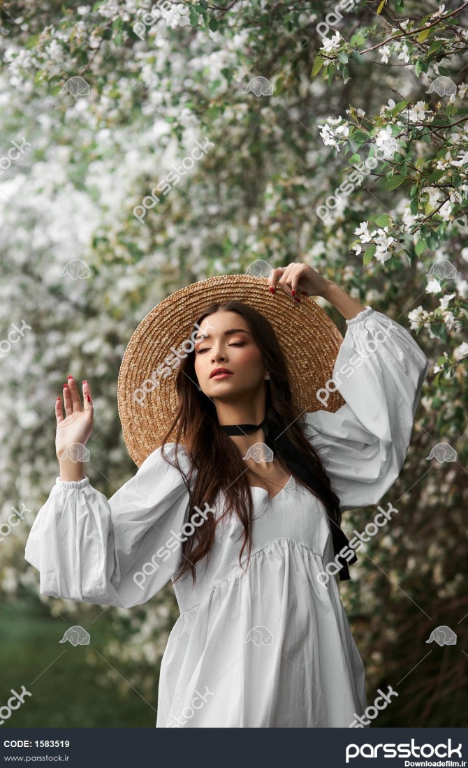 زنی با موهای قهوه ای با کلاه حصیری بزرگ و لباس سفید در پس زمینه درختان سفید شکوفه ژست می گیرد ظاهر رمانتیک زیبایی طبیعی پوست صورت تمیز - بزرگترین مرجع خرید و فروش عکس و طرح لایه باز با کیفیت بالا در ایران در پارس استاک.