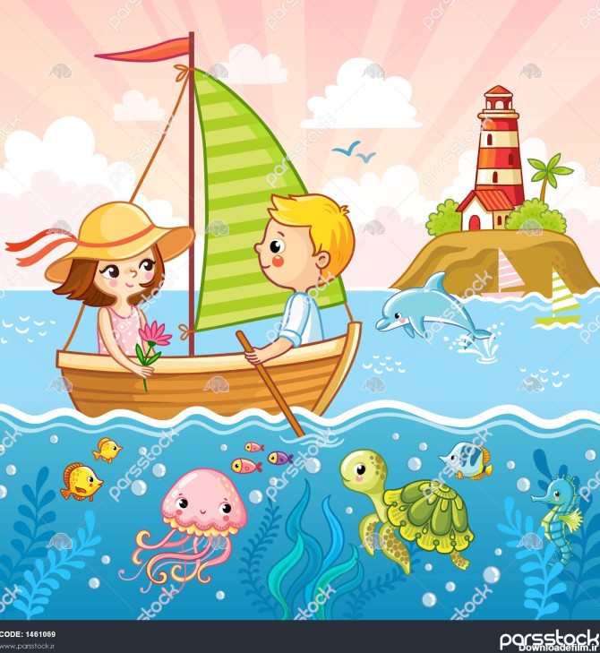 یک پسر و یک دختر در حال قایقرانی با یک قایق بادبانی کنار دریا هستند تصویر برداری با کودکان و حیوانات دریایی - بزرگترین مرجع خرید و فروش عکس و طرح لایه باز با کیفیت بالا در ایران در پارس استاک.