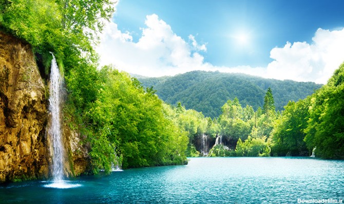 عکس با کیفیت بالا طبیعت زیبای آبشار و دریاچه با درختان و کوه های زیبا در تابستان و آسمان آبی یا دانلود عکس با کیفیت طبیعت بکر و کوه و جنگل و چشم انداز
