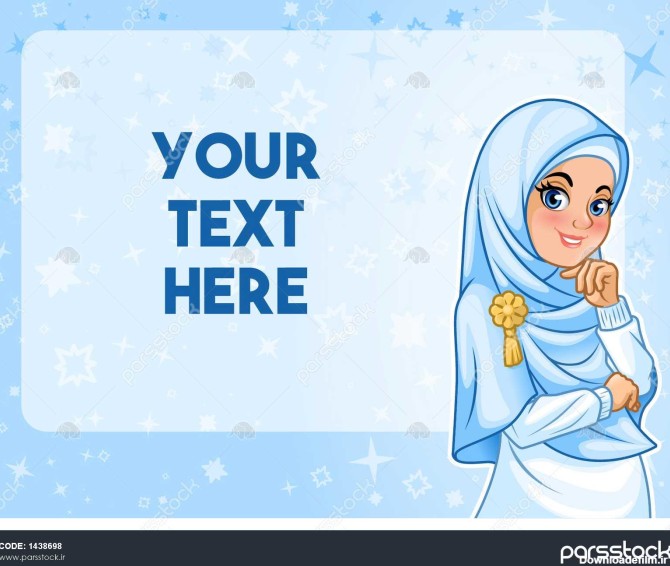 زن مسلمان با حجاب حجاب با دست خود را زیر چانه با متن شخصیت کارتونی طراحی در برابر پس زمینه آبی تصویر برداری بردار - بزرگترین مرجع خرید و فروش عکس و طرح لایه باز با کیفیت بالا در ایران در پارس استاک.