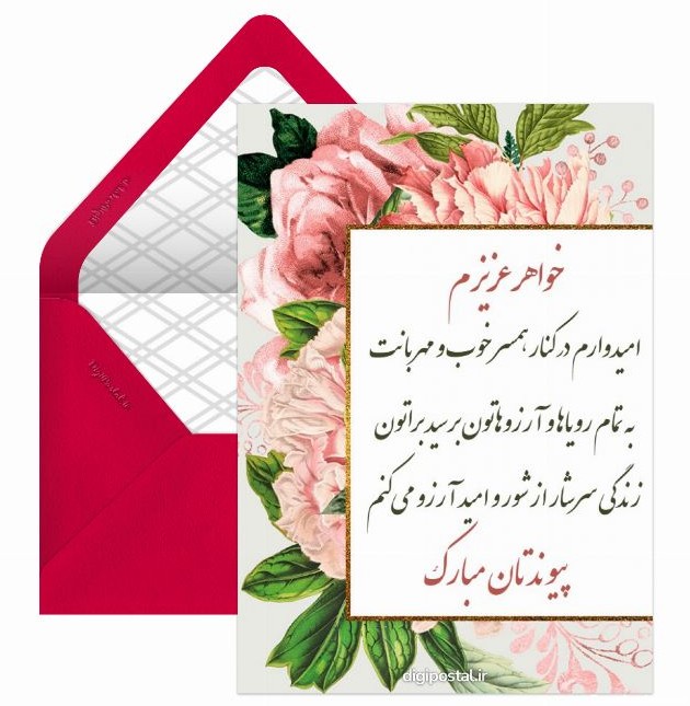 کارت پستال خواهر عزیزم امیدوارم در کنار همسر خوب و مهربانت به تمام رویاها و آرزوهاتون برسید براتون زندگی سرشار از شور و امید آرزو میکنم پیوندتان مبارک, پریا - بی کلام, کارت پستال تبریک ازدواج خواهر موزیکال - کارت پستال دیجیتال