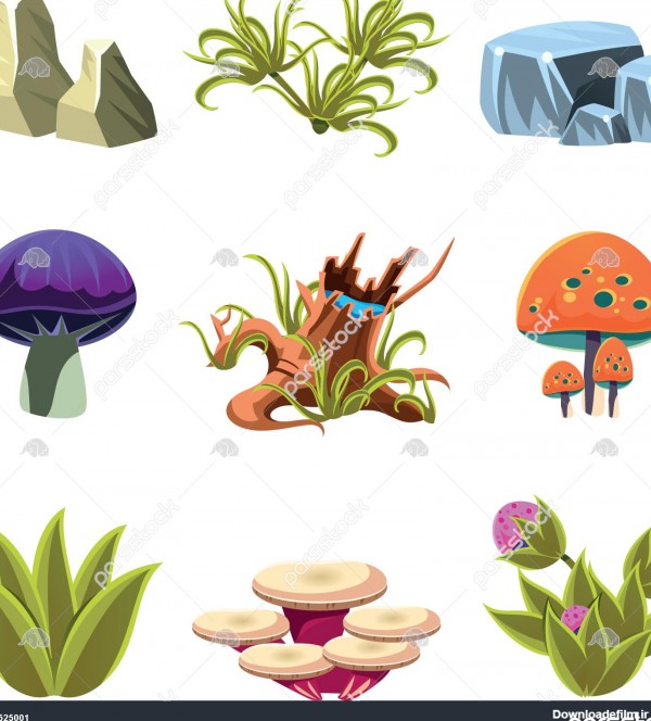 قارچ های کارتونی سنگ ها و بوته ها تصویر برداری را تنظیم می کنند - بزرگترین مرجع خرید و فروش عکس و طرح لایه باز با کیفیت بالا در ایران در پارس استاک.