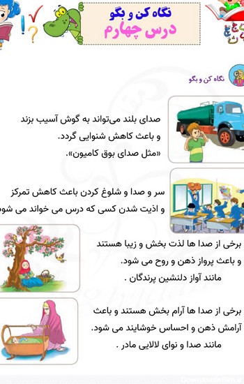 نگاه کن و بگو (صفحه 26 کتاب درسی) | درست، نادرست (صفحه 26 کتاب درسی) | واژه سازی (صفحه 27 کتاب درسی) | بیاموز و بگو (صفحه 27 کتاب درسی) | درک و دریافت (صفحه 30 کتاب درسی)