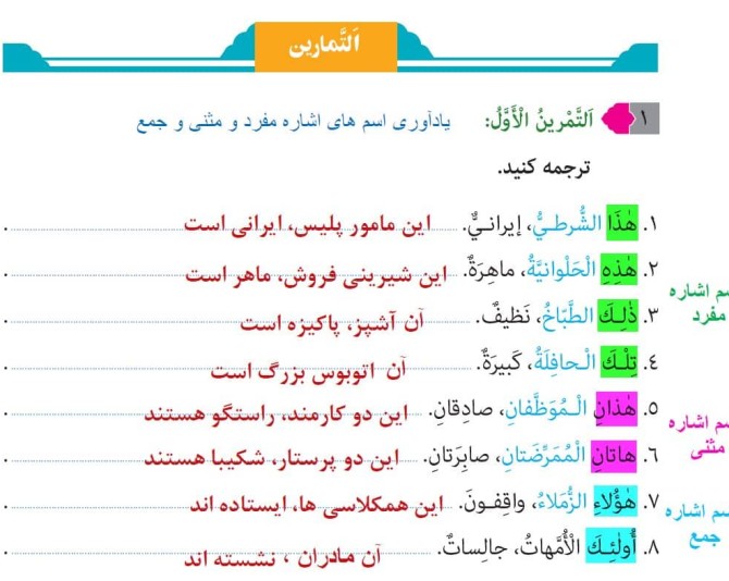 حل تمرین درس اول عربی هشتم | معنی صفحه 2 و درس 1 | گام به گام تمرینات صفحه12 و 13 و 14 و 15 و 16 و 17 و 18 و 19 و 20 و 21 کتاب عربی هشتم