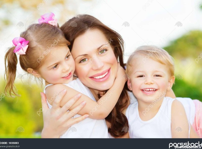 تصویر از مادر جوان بغل کردن دو فرزند کوچک ، پرتره نزدیک از خانواده شاد ، زیبا دختر سبزه با دختر و پسر در فضای باز در زمان بهار ، چهره خندان ، شادی و عشق مفهوم - بزرگترین مرجع خرید و فروش عکس و طرح لایه باز با کیفیت بالا در ایران در پارس استاک.