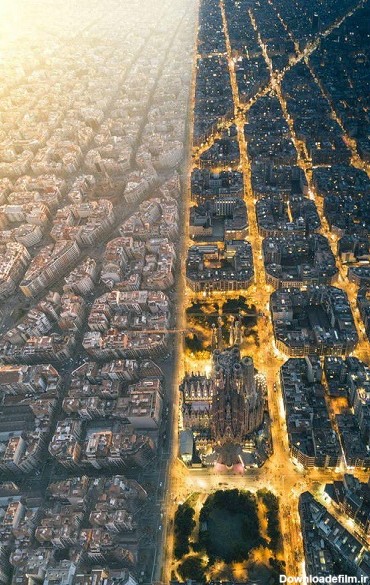 دو تصویر در کنار هم گذاشته شده از نمای شهر بارسلون اسپانیا را در شب و روز مشاهده میکنید.