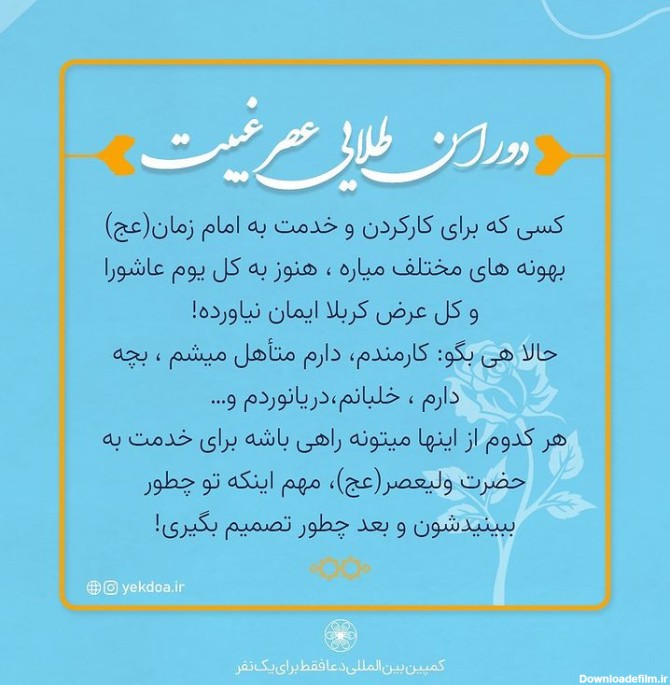 کسی که برای کار کردن و خدمت به امام زمان(عج) بهونه های مختلف میاره،هنوز به کل یوم عاشورا و کل ارض کربلا ایمان نیاورده ! حالا هی بگو
