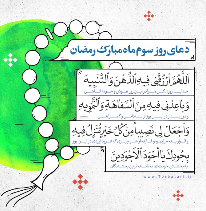 در دعای روز سوم ماه رمضان بنده به خداوند عرض میکند: خدایا در این روز مرا هوش و بیدارى نصیب فرما و از سفاهت و جهالت و کار باطل دور گردان و از هر خیرى که در این روز نازل مى فرمایى مرا نصیب بخش به حق جود و کرمت، اى بخشندهترین بخشندگان عالم.