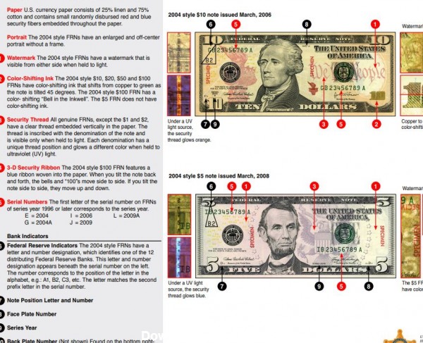 ویژگیهای فیزیکی اسکناس مانند جوهر، واترمارک و متن راه های شناسایی دلار تقلبی برای کمک به مردم برای تشخیص پول واقعی هستند.