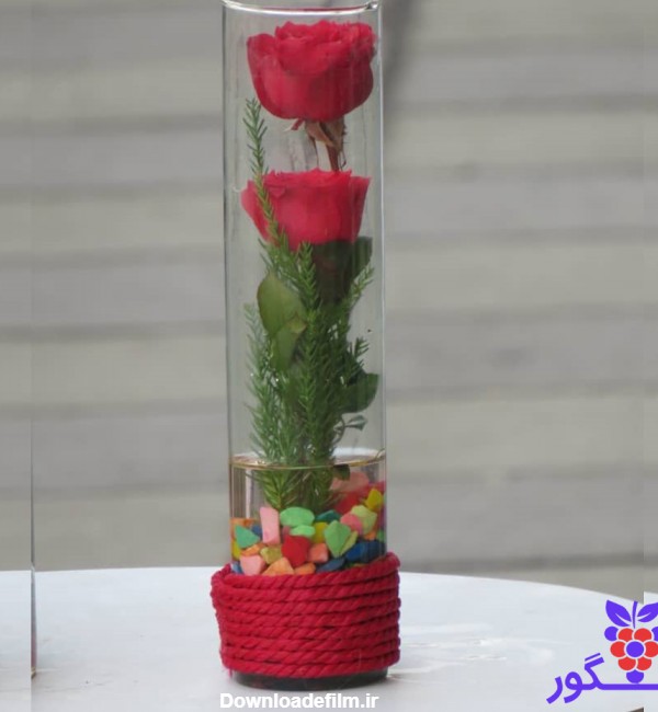 سفارش و خرید آنلاین تنگ شیشه ای گل رز با قیمتی مناسب به همراه دو شاخه گل رز سرخ مناسب برای روز ولنتاین، روز مادر + ارسال به سراسر ایران