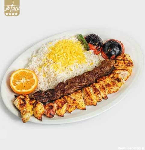 محتویات : یک سیخ 110 گرم کوبیده + یک سیخ ۲۵۰ گرم جوجه+ برنج طارم + کره + زعفران + ۲ عدد گوجه کبابی + فلفل کبابی + ته دیگ + نارنج + پیاز + سماغ + نان