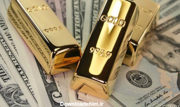 عکس با کیفیت چند شمش طلا همراه با سکه طلا و نمادهای ارزی شامل یوآن ، دلار ، پوند و یورو