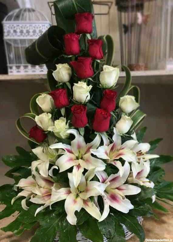سبد گل زیبا با سفارش عکس انواع تصاویر مدل شامل طراحی تزیین گلهای رز زیبا رز قرمز سفید نمونه طبیعی مصنوعی برای تولد نامزدی خواستگاری جدید س