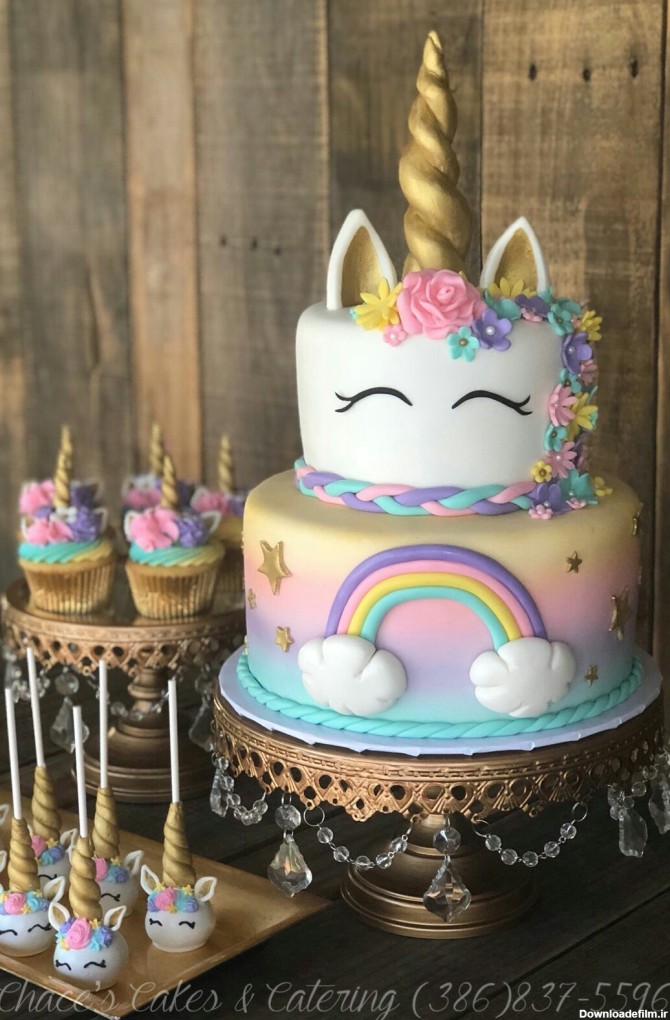 کیک دو طبقه، کاپ کیک و پاپ کیکهای جشن تولد دخترونه با تم یونیکورن (اسب تک شاخ)