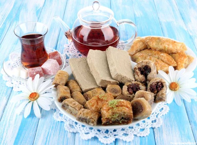 دانلود عکس با کیفیت قندان در کنار لیوان کمر باریک چای و دو قند در کنار لیوان و رو میزی زیبا فیروزه ای + این تصویر مورد استفاده برای: فروشگاه قند و نبات و خوراکی ( غذا و نوشیدنی ) + با رنگ بندی: قرمز و سفید و فیروزه ای