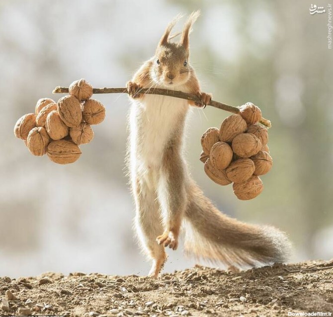 گرت وگن ۵۲ ساله برای گرفتن عکس از سنجاب ها در ابتکاری جالب در باغ نزدیک خانهاش در بیسپگاردن سوئد چند گردو را به دو سر یک چوب وصل کرده و آن را به شکل یک وزنه درآورده است.